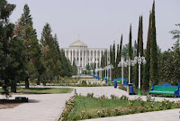 Von jedem grösseren Gebäude und von Plakatwänden grinst uns der Präsident Rakhmonov entgegen. Erste Veränderungen sind erkennbar: die Nationalfarben haben von blau-weiss-grün auf rot-weiss-grün gewechselt und plötzlich sind auf der Strasse auch Mercedes, BMW, Opel etc. zu sehen. Währenddem in Usbekistan sich die Markenvielfalt der Autos hauptsächlich auf Damas (Daewoo) beschränkte. Noch immer rufen die Kinder "hello" vom Strassenrand und die Erwachsenen hupen oder fragen "Atkuda?"(woher kommst du?).